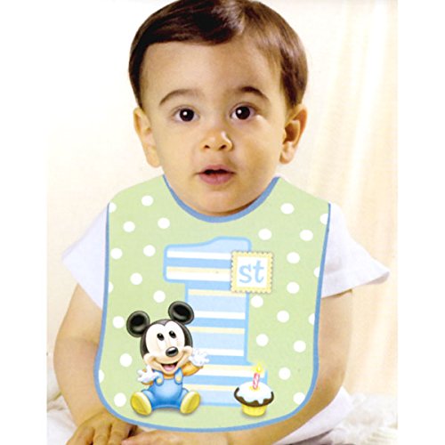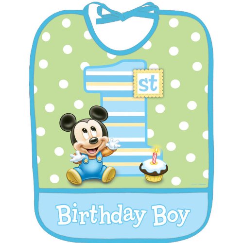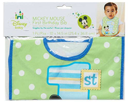 -. Binding : Baby Product -. Brand : Napkins -. ClothingSize : One-Size -. Color : Blue -. Department : baby-boys -. EAN : 0013051388584 -. Feature : 1 vinyl bib / Measures 10 in x 14 in / Velcro closing for easy wear / Bib features baby Mickey with a large striped number one and a cupcake on green background with white polka dots / Perfect American Greetings party supplies for a baby's first birthday party or Mickey Mouse-themed party -. IsAdultProduct : 0 -. ItemPartNumber : 439577 -. Label : Napkins -. Manufacturer : Napkins -. Model : AM-439577 -. MPN : 439577 -. NumberOfItems : 1 -. PackageQuantity : 1 -. PartNumber : 439577 -. ProductGroup : Toy -. ProductTypeName : BABY_PRODUCT -. Publisher : Napkins -. Size : One Size -. Studio : Napkins -. Title : Mickey's 1st Birthday Baby Bib -. UPC : 013051388584