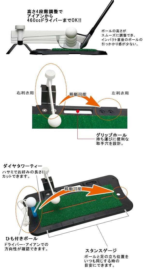 【注意】 ●床に直接置かないでください。床が変色する場合があります。 ●ゴルフの練習以外の用途には使用しないでください。 ●周囲の安全には十分注意してください。 ●使用する前に必ず各部所に異常が無いか確認してください。 ●変形、破損したまま使用しないでください。 ●破損の原因になりますので、マットを固定して使用しないでください。 ●土や砂の上では滑ることもありますので、注意してください。 平坦で水平な所で使用してください。 ●素振りの場合であっても、極端にダフった場合にはマット本体が飛ぶこともありますので、周囲の安全には十分配慮してください。 ●ひも付きボールはショット後に元の位置に戻ってくる可能性がありますので、注意してください。 ●ひも付きボールがスイング時にシャフトにからまない様に注意してください。 ●ひも付きボールの紐のつなぎ目をチェックし、早めに交換してください。 ●タワーティーに切り込みを入れる際に思わぬ怪我をする可能性がありますので、十分注意してください。 ●お子様の手の届かない所に設置、保管してください。 ●屋外で長時間放置すると破損の原因になりますので、使用後は屋内に保管してください。 ●暖房器具の熱や温風が直接当たる場所、直射日光のあたる場所には放置しないでください。 熱や紫外線の影響により変形、変色、変質することがあります。 ●取扱説明書は大切に保管してください。 |