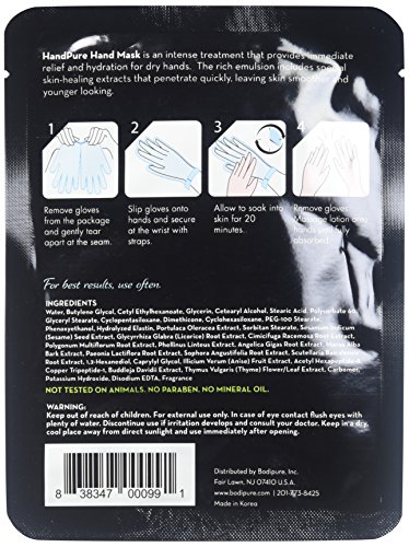 HandPure Hand Mask is an intense, all-in-one anti-aging treatment that provides immediate relief and hydration for dry hands. The rich emulsion includes special skin-healing extracts that penetrate quickly, leaving skin smoother and younger looking. Not tested on animals. No paraben or mineral oil. One size fits all.Feature