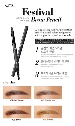 [Features] [VDL] Festival Brow Pencil 0.2g - A long lasting eyebrow pencil that creates natural colors and goes on with a powdery and soft touch. - Brush included for professional brow make up. [Capacity] 0.2g [How to Use] Use brush to comb eyebrows. Use pencil to draw and fill in eyebrows. COSMETICS BRAND: VDL Popular tags None My tags Sign in to enter tagsFeature