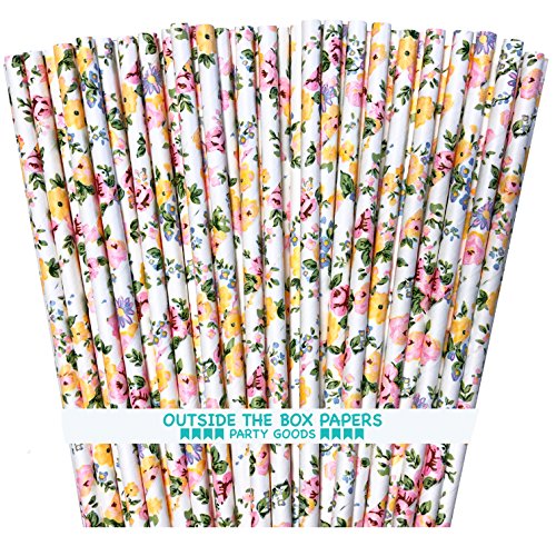 Outside the Box Papers Rose Floral Paper Straws 7.75 Inches 100 Pack Yellow, Pink, White