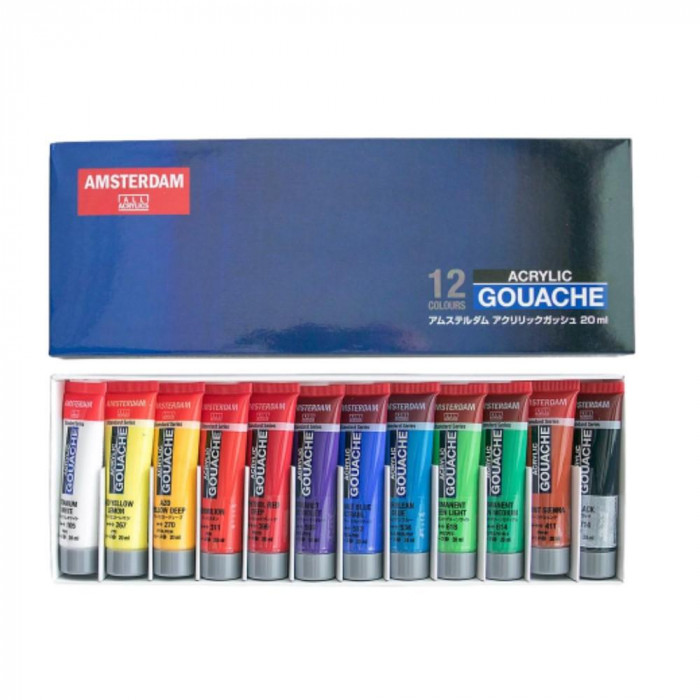 ロイヤルターレンス社製のアクリル絵具・12色セットです。筆ムラが出にくく、ツヤのないマット調の塗面に仕上がり、乾燥後は耐水性になります。また下地の色を隠す強い被覆力があります。透明チューブなので色目や残量が確認しやすく、最後まで無駄なく使用できます。 |