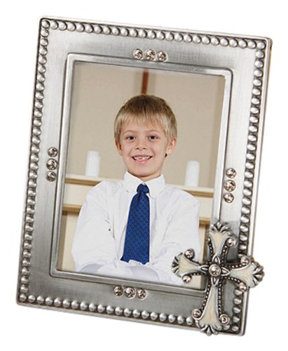 - The pewter finish metal frame measures 4.5" x 3.5" and features a beaded border, glistening rhinestone accents and a dramatic cross shaped pewter colored poly finish accented ivory inlaid enamel charm in the lower corner.