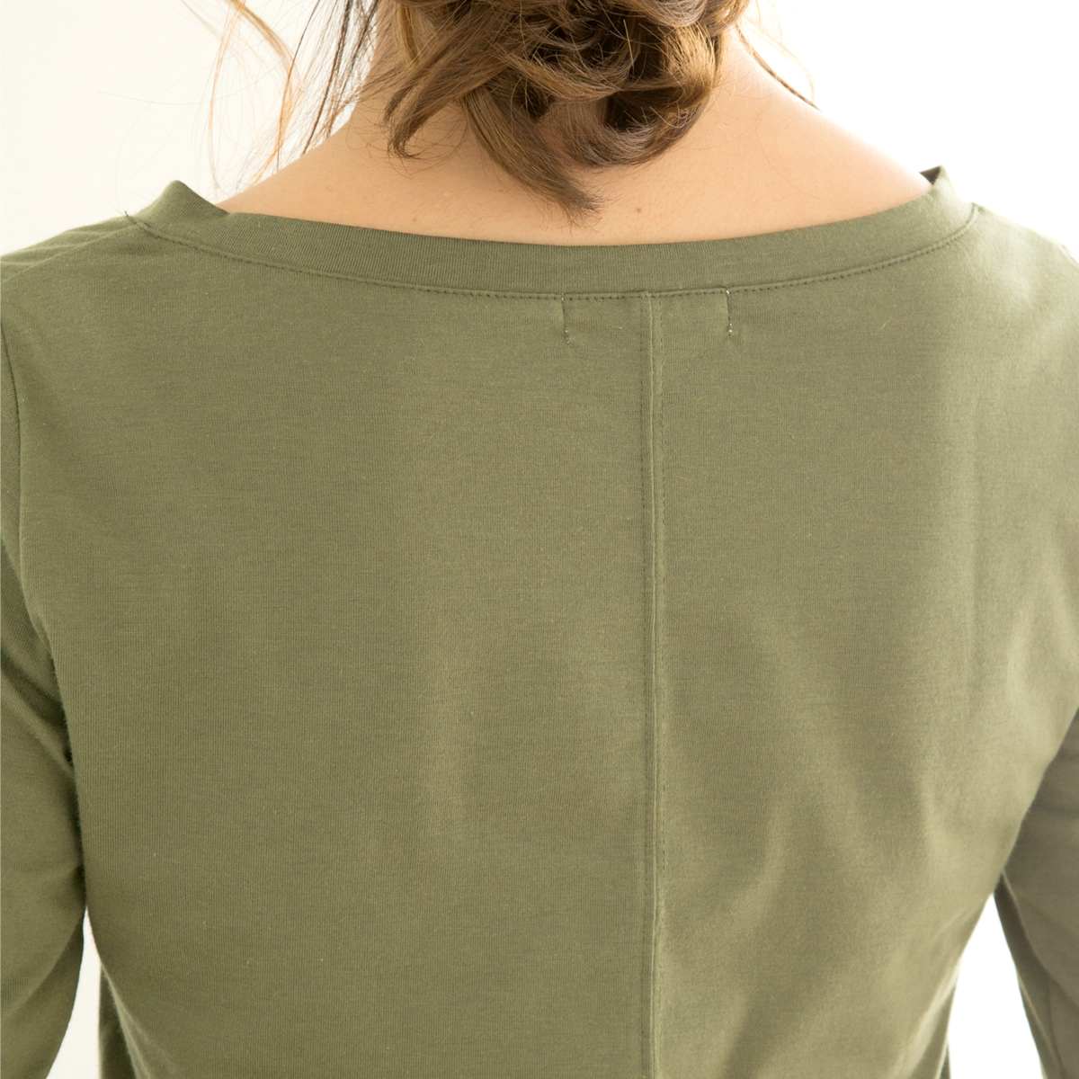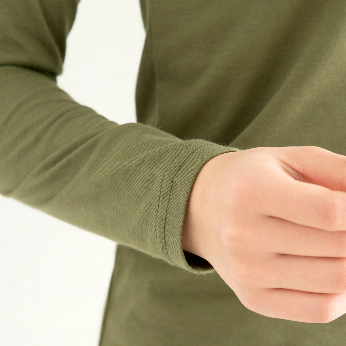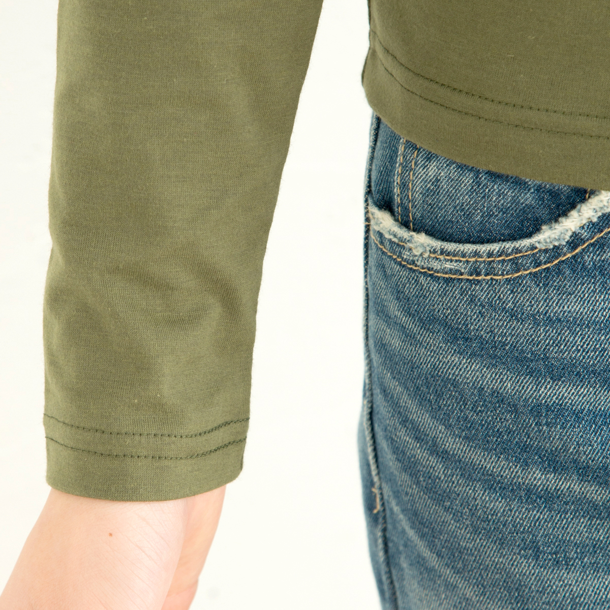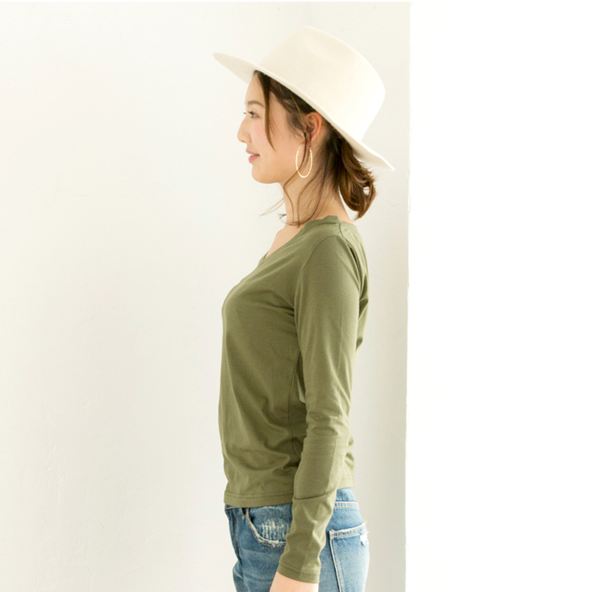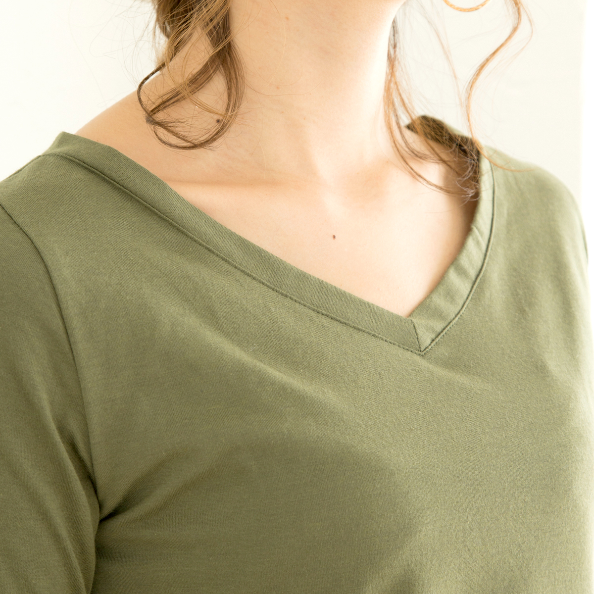 シンプルで着回ししやすい、1枚は持っておきたいVネックのトップスです。さらっとしていて着心地もよいので、インナーとしても活躍できる1枚です。Vネックなのでデコルテ周りをきれいに見せてくれます。