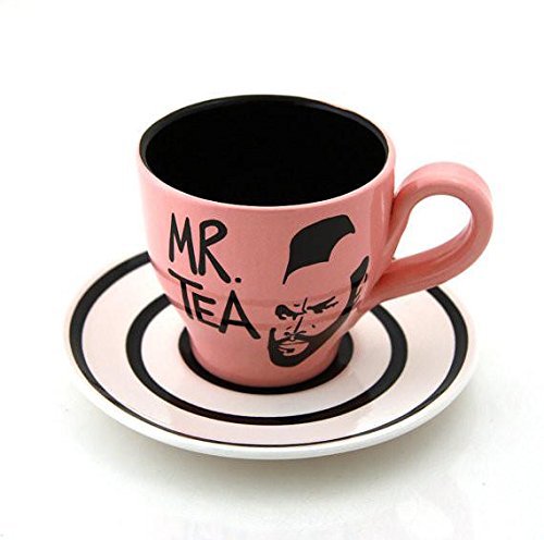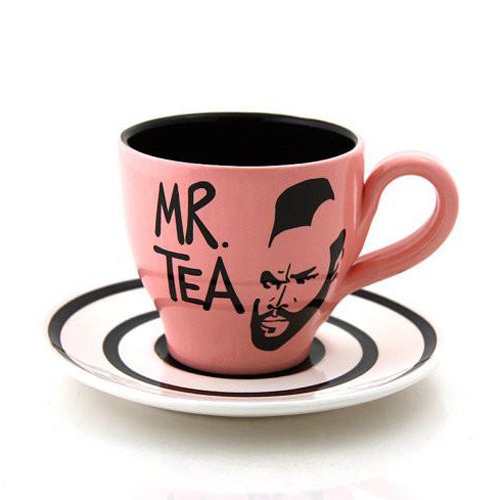 Product Description Mr. T Tea Teacup and Saucer in bubble gum pink This is a one of a kind teacup and saucer set featuring Mr. T-or Mr Tea for chai lovers--and I pity the fool that doesn't love this 80s icon! The teacup is glazed a glossy bubble gum pink on the outside- jet black on the inside. its saucer features black concentric circles. This item is handmade from earthenware clay, kiln fired twice to 1900 degrees. All lead free, non toxic materials used--made to be used and enjoyed--safe to dishwash and microwave. This is a larger sized teacup: Cup 31/2 x 3 3/8 Saucer 6 1/4 Holds 10 oz 0