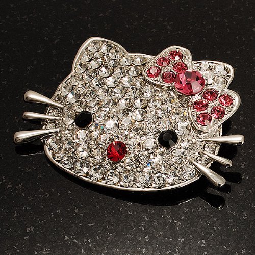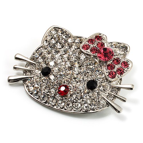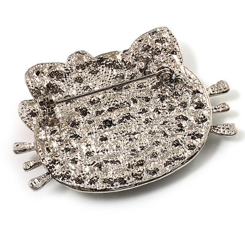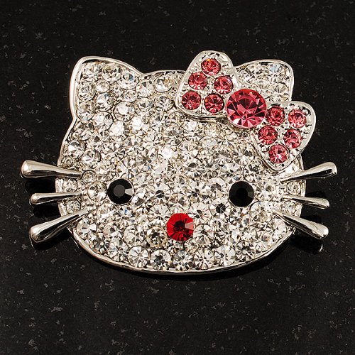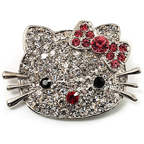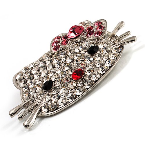 Bring a fun feline touch to your look with this Cute Dazzling Kitten With Pink Bow Brooch. Featuring an adorable kitten design, crafted in silver tone metal and decorated with pave set clear crystals. The eyes made of black crystals, the nose and the bow of pink crystals. The brooch measures about 5.7cm x 4cm and secures with a flag pin and revolver clasp.Feature