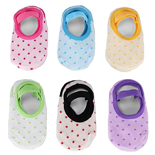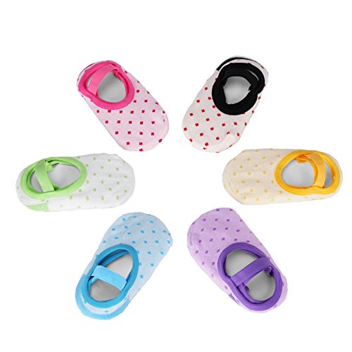 baby anti slip socks:The pack comes with 6 individually wrapped pink, purple, green, yellow, blue , black and red socks. The socks have a cute little strap to help keep the socks on. The strap is a comfortable fit too. Tight enough to keep them on.