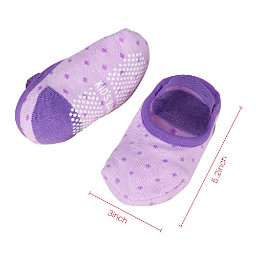 Grip socks for toddlers: The socks are decently thick and roomy - will fit a variety of age ranges easily. Even if your child's feet are small you will get a lot of use out of these because they have room to grow into them. The socks also have a nice amount of stretch to them and are really easy to slide on. The strap across the top keeps them in place but is not tight against the foot so its comfy for them to wear.