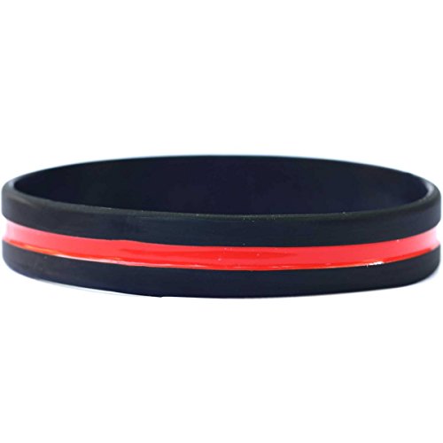 -. Feature : 1 child size high quality thin red line wristbands. / Represents firefighter support. / Thin red line on contrasting black background. / Line is debossed and color filled from unique mold. / Will not wear off like screen P.R.Inted wristbands.