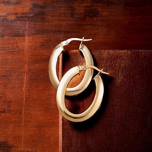 With a commitment to quality and affordability, Ross-Simons presents timeless jewelry for the modern woman. Expertly sculpted by our Italian goldsmiths, these oval hoop earrings are classically beautiful in polished 14kt gold with a flat profile. Hanging length is 1". Snap-bar, 14kt yellow gold hoop earrings. Each Ross-Simons item arrives in a fine jewelry presentation box. Shop Ross-Simons jewelry risk-free as all items include a 30-day, 100% money-back guarantee.Feature