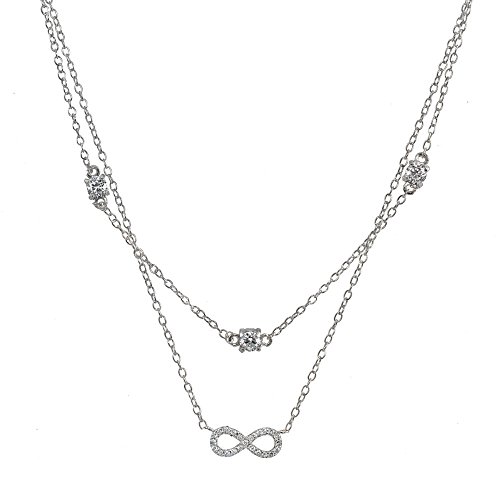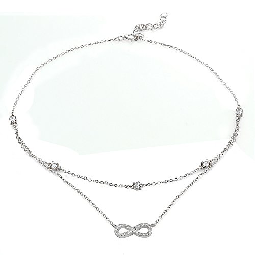This attractive necklace features a thin choker chain and necklace; showcasing a fashionable layered style. There are 3mm cubic zircnoia stones stationed on the choker, and a cubic zirconia studded infinity dangling off the necklace. The necklace is 13" long plus a 4" extender. It is crafted of sterling silver.