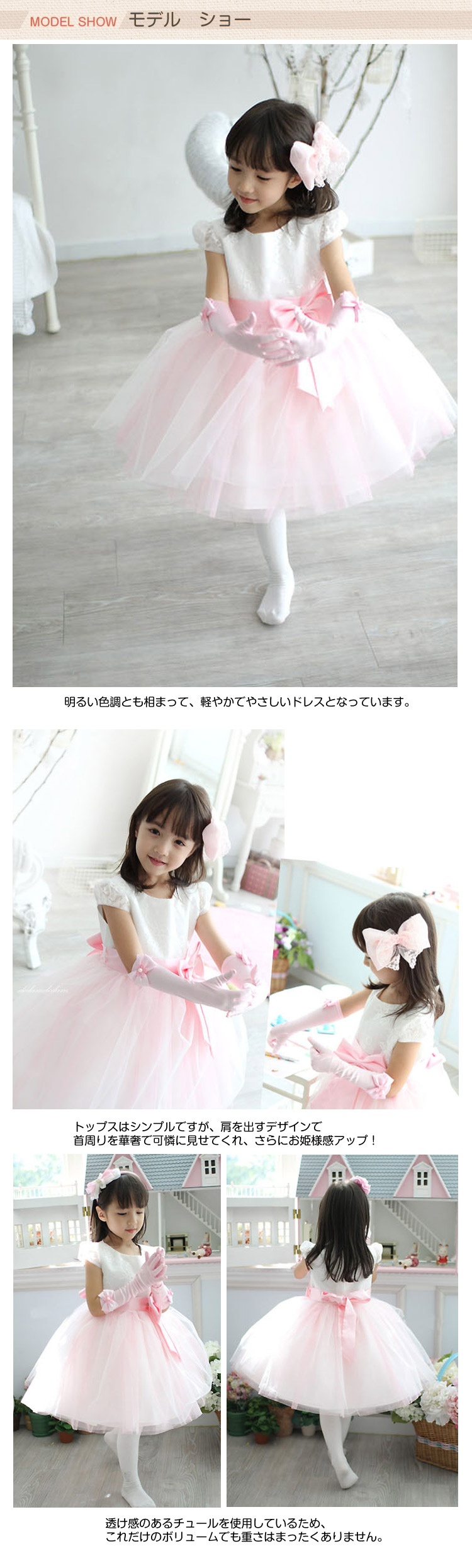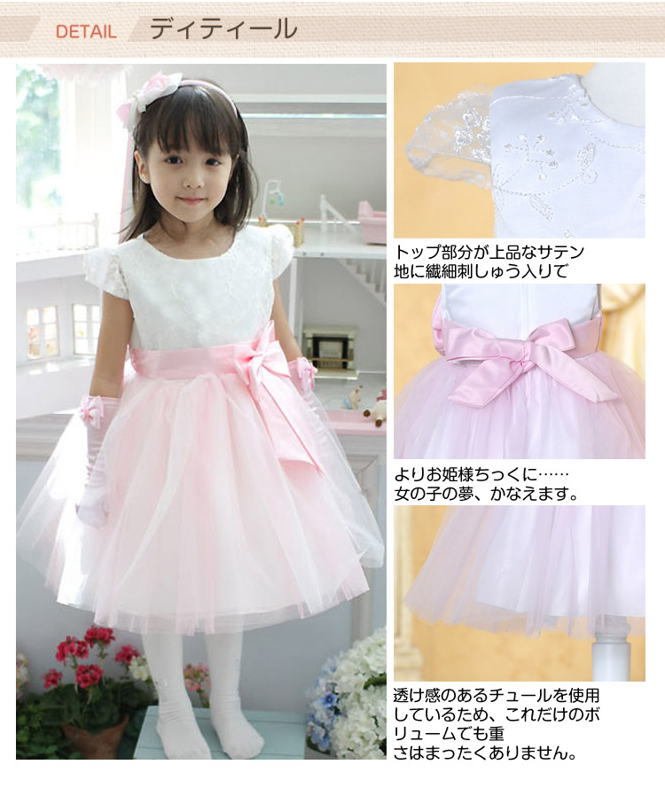 | お花刺繍Sweetドレス?ふんわり広がるスカートがやさしい雰囲気でキュート☆後姿を飾るリボンがまるで蝶々のようでドレスをさらに素敵に輝かせています。淡いカラーの裏地の上から薄いソフトチュールを重ねた、ボリュームのあるスカートが華やか。透け感のあるチュールを使用しているため、これだけのボリュームでも重さはまったくありません。明るい色調とも相まって、軽やかでやさしいドレスとなっています。トップスはシンプルですが、肩を出すデザインで首周りを華奢で可憐に見せてくれ、さらにお姫様感アップ! | |