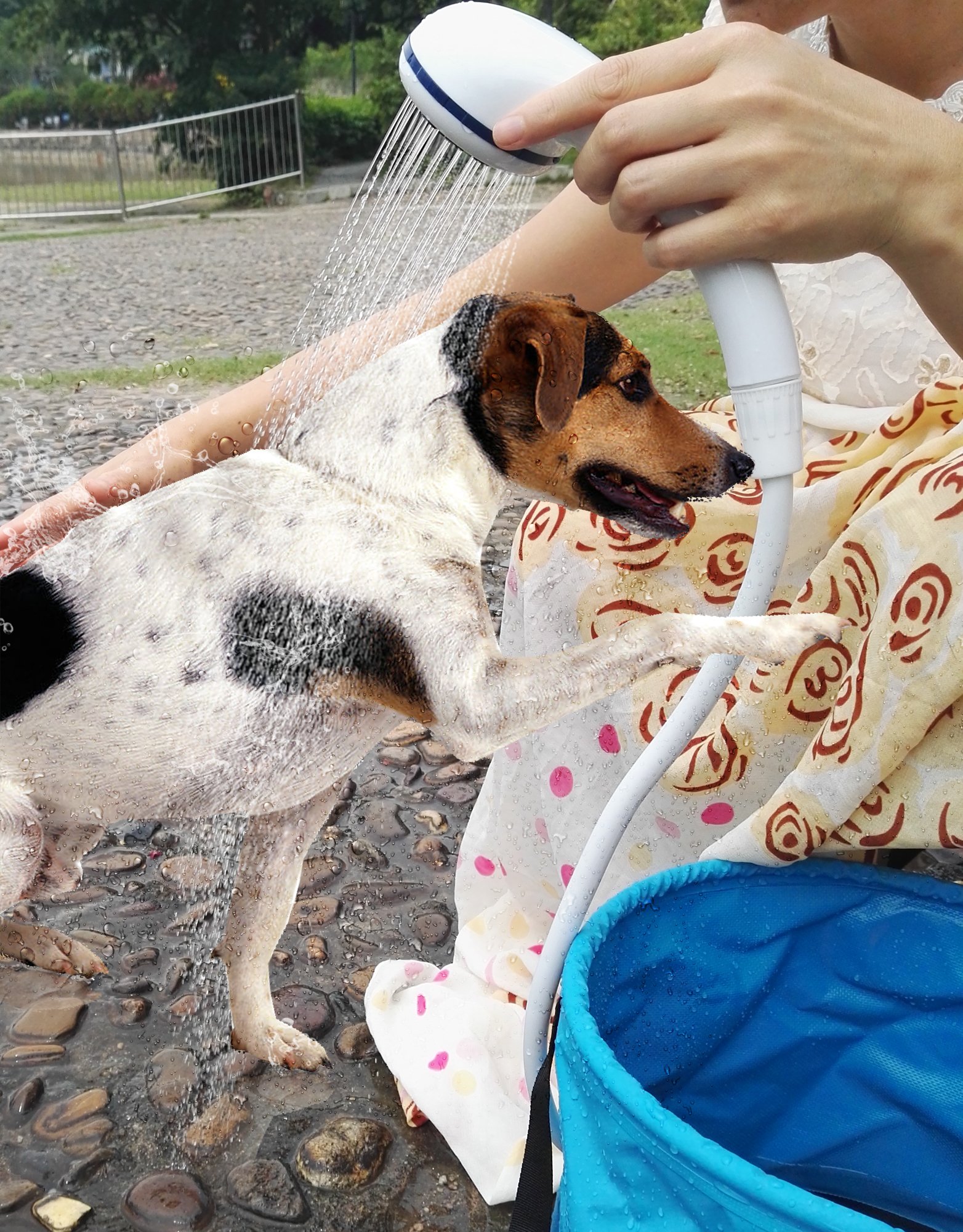 A portable electric shower head is equipped with a low electricity lamp (red), a charge notification lamp (blue), with a USB - DC cable.