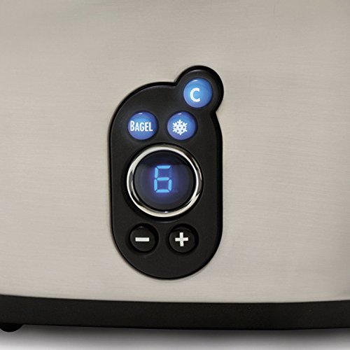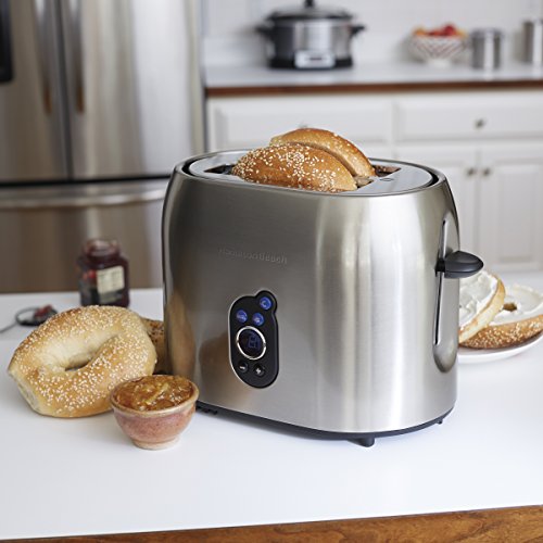 The Hamilton Beach Digital 2 Slice Toaster has a smudge proof brushed finish with a digital display that shows toast shade at a glance. Other functions include: bagel toasting, defrosting, toast boost, and cancel.