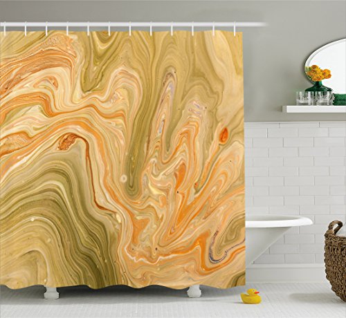 Marble Shower Curtain by Ambesonne, Antique Ethnic Ottoman Art Ebru Turkish Marbling Modern Artwork, Fabric Bathroom Decor Set with Hooks, 75 Inches Long, Orange Olive Green Sand Brown