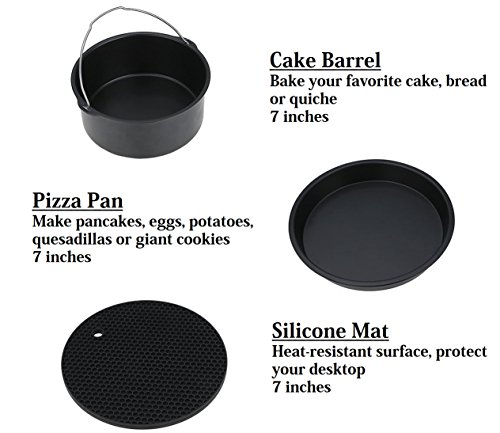 NOT TO FEEL OFF PAINTING: Cake barrel and pizza pan using high-quality materials, there is a protective layer (with anti-stick coating) on the air fryer Accessories surface, don,t use hard things to rub, your cake will not have black paint.