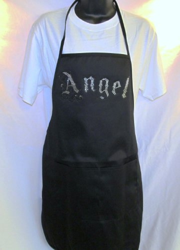 Classic Black Apron - " Angel "- Rhinestone on Poly Cotton Blend Two Pocket Apron