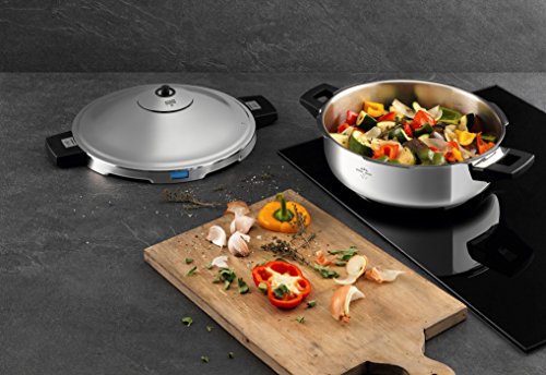 If you cook for a crowd try the Kuhn Rikon Duromatic 8-Quart Hotel Pressure Braiser. serves 6-8. Everything about it is thicker and heavier to stand up to daily use year after year. The pan has a unique 11-inch diameter so there is lots of cooking surface for browning and sauteing. The aluminum heat-conducting base is especially thick. The short, stay-cool handles save space on the stovetop and for storing. This pressure cooker features an automated lid-locking system and safety release back-up system to give you ultimate peace of mind. Its spring-loaded valve eliminates guesswork. You see the exact pressure and know exactly when to start and stop cooking. So, there is no danger of overcooking and no noisy steam escapes. It's blissfully quiet. Cook healthy delicious meals in minutes, not hours. Easy to use with its interior fill lines, automatic locking system, and precision spring-loaded pressure release valve. Cooking with a Duromatic Pressure Cooker not only saves an incredible amount of time, it produces exquisitely delicious food. Vitamins are sealed in, instead of boiled away, vegetables keep their bright colors and flavors are so intense less seasoning is needed. While you are saving time you are also saving money and natural resources. Using a Duromatic Pressure Cooker also conserves energy. Included is Quick Cuisine Cookbook, a $14.00 value - free.Feature