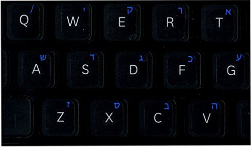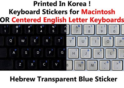 Hebrew Keyboard Stickers with Blue Lettering on Transparent Background for Mac / Centered Windows Keyboard