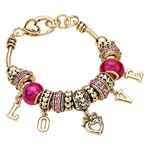 -. Feature : Lovely pink color and beautifully detailed gold tone charm bracelet / Absolutely stunning beads with Crystal embellishment / Dangle letter charms spell "Love" with dangle heart charm in center / Size: 7" length with lobster closure, clasp has heart accent / Packaged in a lovely gift box