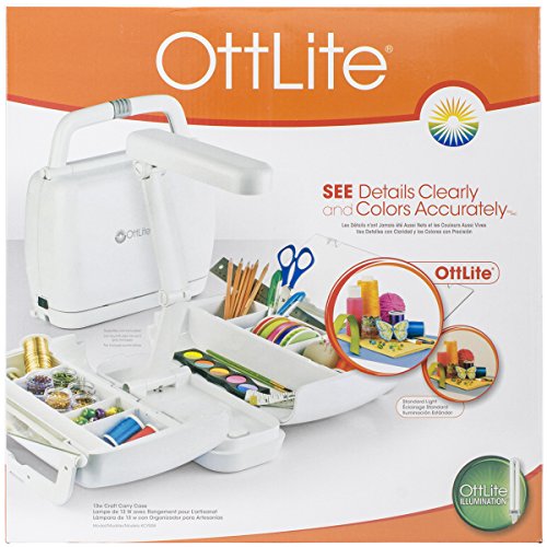 OttLite-Craft Carrying Case With Lamp: White. The ultimate portable lighting and storage solution for crafters on the go! A portable craft lamp that also keeps your tools and supplies organized. The collapsible shade pivots and tilts to illuminate your project area and adjustable storage compartments hold everything from smaller notions to larger tools. Everything folds closed into a compact carrying case. The base hides a cord storage reel and clip plus an extra electrical outlet great for glue guns and other tools. This package contains one 13w craft carry case measuring 29-1/2x13-1/4 Inch when opened and adjusts from 10 Inch to 20-1/4 Inch. Uses replacement bulb E PL13-E (one OttLite included). Imported.Feature