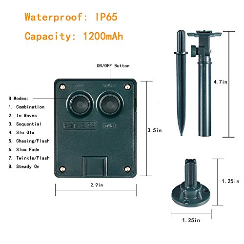 - ✔️ LONG WORKING TIME: 8 hours working time once fully solar-charged, enjoy the lights for whole night with 8 different modes: Combination, In wave, Sequential, Slo glo, Chasing/Flash, Slow fade, Twinkle/Flash, Steady On