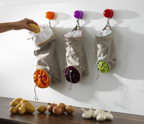 So many of us have purchased that economy-sized bag of vegetables, only to find that the vegetables have spoiled or sprouted before we can use all of them. You don't have to spend your hand-earned money on food destined to be thrown out before you can use it. Orka Vegetable Keep Sacks are the economical way to store your root vegetables out of the way, but within easy reach. These sacks keep out light, slowing down the sprouting and spoiling process, prolonging shelf life. Drawstrings at the top and bottom mean you can add vegetables and remove them easily-always using the older vegetables first. The convenient handing loop lets you hang your vegetables up and out of the way, but keep them within easy reach for meal preperation. The all-cotton design allows these unique sacks to be machine washable, a more economical solution to some of the one or two-use bags out on the market. These bags are so revolutionary, they received the coveted Gourmet Gold award in the Tabletop and Textiles category for 2009. The Onion Vegetable Keep Sack holds up to 4 pounds of vegetables for added convenience. Bring innovation and savings to your home, with the Orka Vegetable Keep Sacks- and stop the cycle of throwing food and money away.Feature