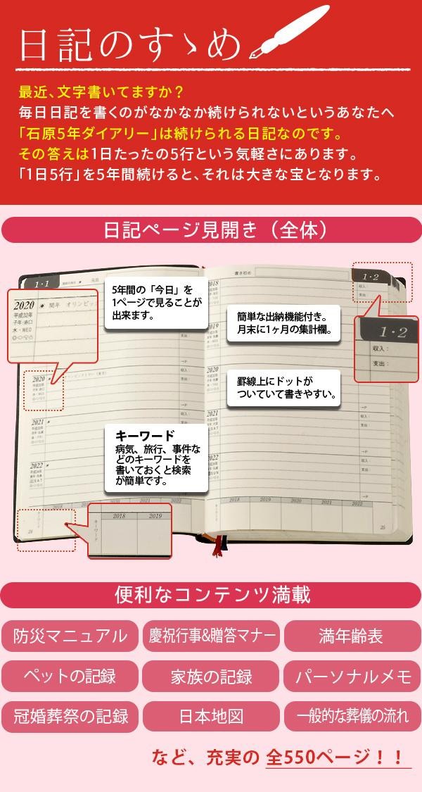 | 持ち運びやすいコンパクトサイズの日記帳。日記の他、パーソナルメモや贈答マナー、慶弔行事、防災マニュアル等、いざという時に役立つ内容も充実しています。ビジネス手帳にもOKな欲張り日記! |
