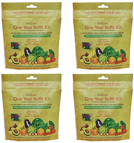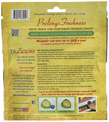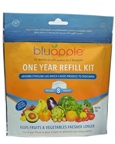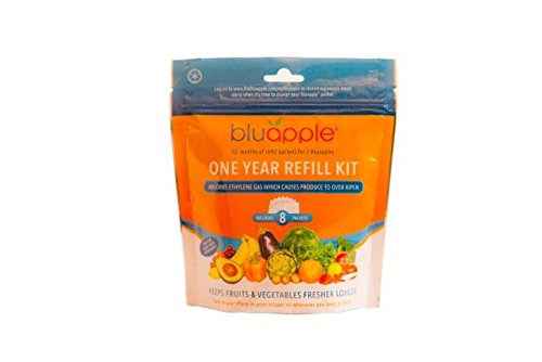 The Bluapple® One-Year Refill Kit rounds out the Bluapple® 2-Pack by providing refills for two Bluapples® for one full year. There are 8 packets inside each Refill Kit. One packet is to be placed inside Bluapple®. The remaining packets need to stay in the resealable bag they were purchased in, or an airtight container. As long as they are kept airtight, they will last indefinitely. A typical family of four throws away as much as $600 worth of spoiled produce each year. Ethylene gas given off naturally by fruits and vegetables hastens their ripening process, which makes it difficult to consume the produce you've purchased before it inevitably goes bad. The Bluapple absorbs excess ethylene gas emitted by produce and extends the life and freshness of fruits and vegetables in your fridge and on your counters. This saves you money and ensures that the healthy food you purchase for your family stays fresh and delicious.