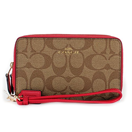 -. Title : Coach Signature PVC Double Zip Phone Wallet F53937 Khaki/Bright Pink
