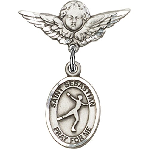 -. Title : Sterling Silver Baby Badge with St. Sebastian/Figure Skating Charm and Angel w/Wings Badge Pin 7/8 X 3/4 inches