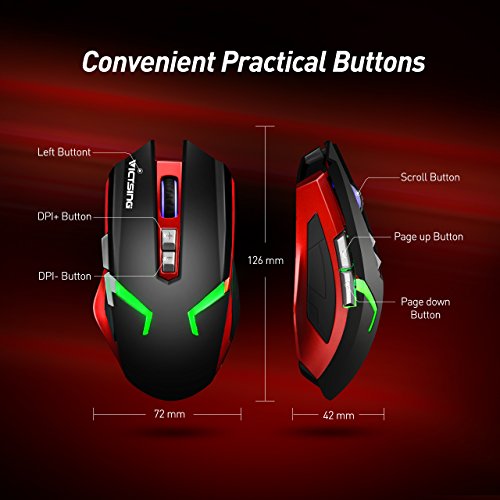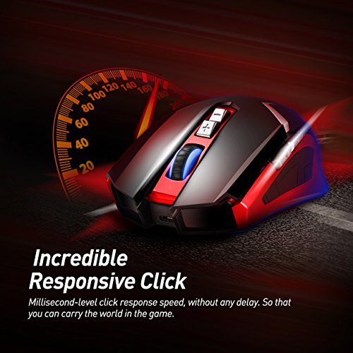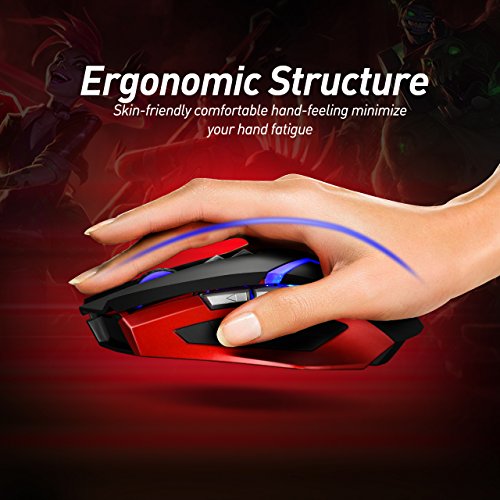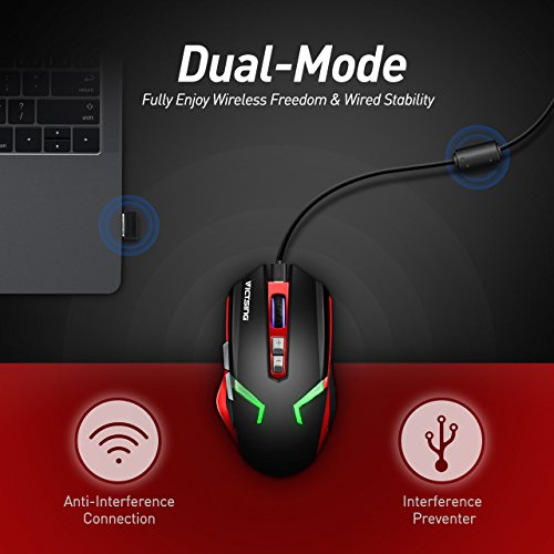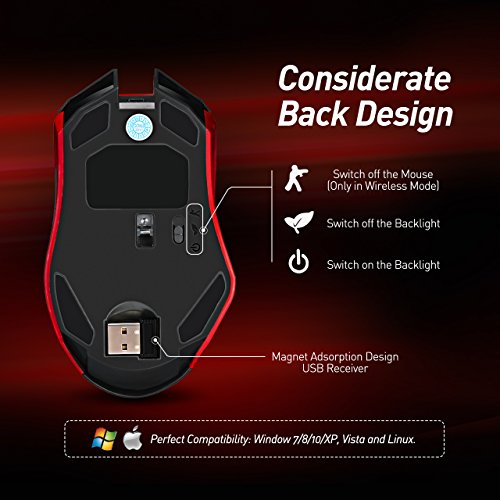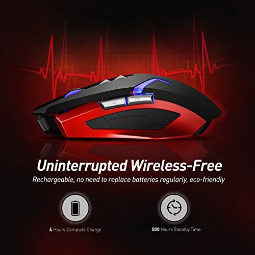 DUAL MODES AND LONG BATTERY LIFE : Support dual ways connection--2.4GHz wireless connection and wired connection. You can enjoy movement freedom in the wireless mode via USB Receiver,its operation range is 10meter(32ft). When battery level is low or some high-precision operation needed, connect it to the computer through USB cable to get the battery charged and bring you perfect stability. Needs 4 hours for full charging, then it can provide a 500 hours standby time.