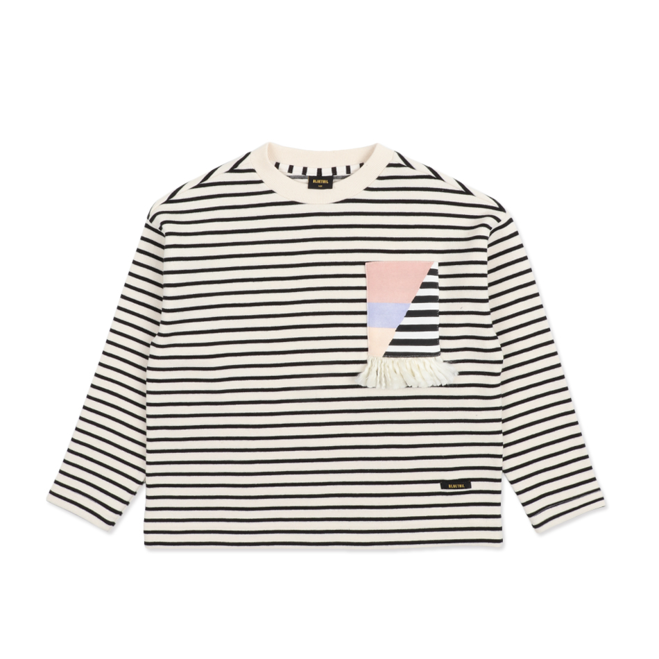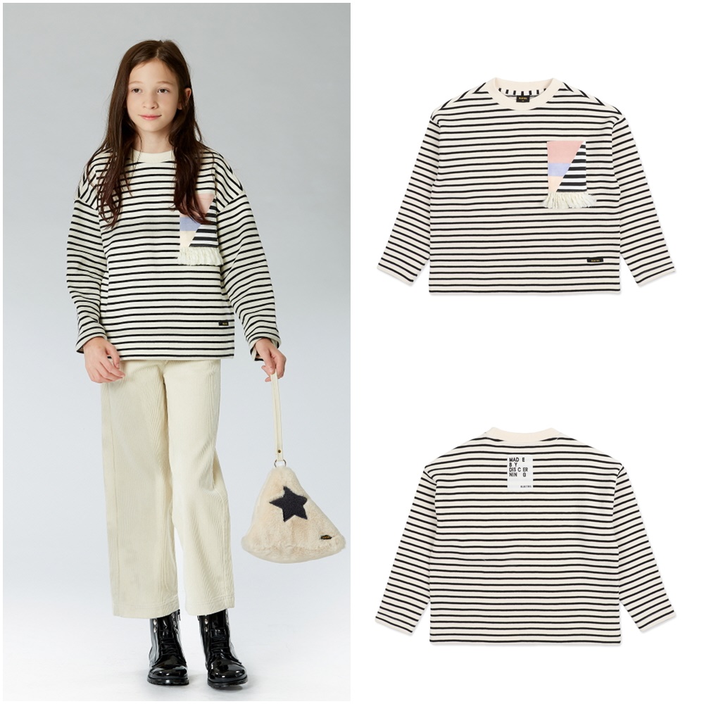 모던한 아이보리, 블랙이 믹스된 스트라이프 티셔츠입니다.