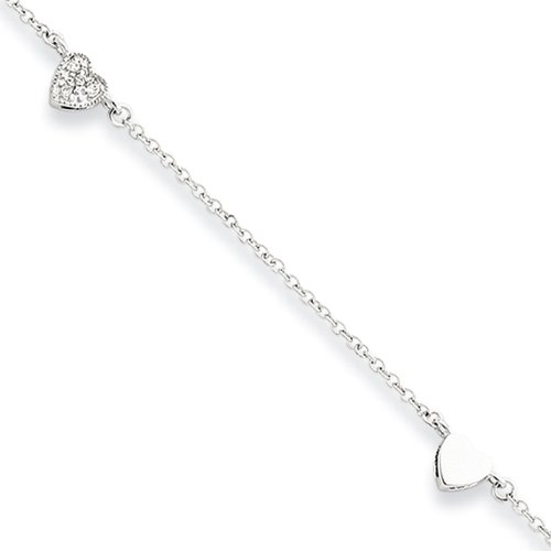 -. Title : Polished and CZ Hearts Anklet in Rhodium-Plated Sterling Silver, 9-10 Inch