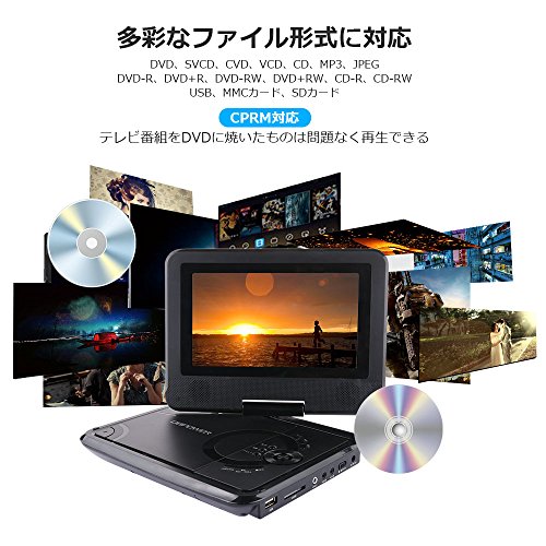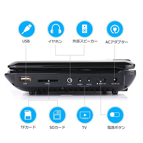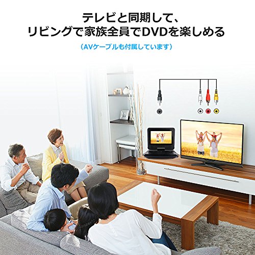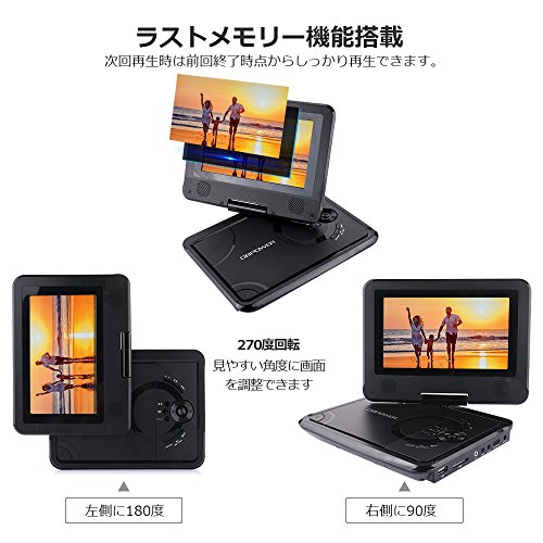テレビと同期可能 付属のAVケーブルを使って、テレビと接続できます。大画面で存分にDVDを楽しめます。 プロジェクターと接続可能 付属のAVケーブルを使って、RCA接続口のあるプロジェクターと接続できます。家でも映画館のように映画を楽しめます。 | 操作簡単 電気製品が苦手な方でも簡単に操作できる。子供が扱っても問題なし!! 高品質材料採用: 高品質の材料を採用し、環境に優しい!! 注意: 初めて使用する時に、ディスクを入れるところの黄色いカードを取り外してください。 | 270度回転 右側に90度、左側に180度、合計270度回転できます。 見やすい角度に調整したり、コンパクトに視聴できます。 ラストメモリー機能搭載 (レジューム機能) 前回のDVD停止位置から続き再生できます。早送りやスキップの操作をする必要がありません。 |