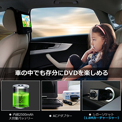 ACアダプター、車載用シガーソケット電源アダプター(12Vの車しかに対応できない)、2500mAh大容量内蔵電池の3電源に対応しているので、屋内はもちろん、屋外、車や新幹線の中など、どこでも手軽にDVDを見ることができます。