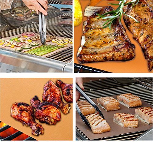 NO SAFETY ISSUES: These BBQ grill mats are made from 100% PFOA-Free materials and premium PTFE-Fiberglass coating (thin for better heating), no PFOA, silicone or other dangerous chemicals! Certified as safe by the FDA approved.