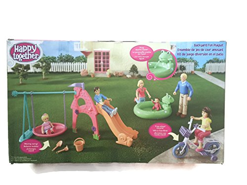 Happy Together playset and accessories have so much fun together as a family - just like you and your little one! Happy Together toys allow girls to play house with the whole family: Moms, Dads, Aunts, Brothers and more! Enjoy a sunny day playing outside with the You & Me Happy Together Backyard Fun Playset. This set includes everything your kids could want for fun in the backyard. It features a turtle shaped kiddie pool, a swing & slide set, bike, bucket, rake and trowel. Makes a perfect accessory for your Happy Together dollhouse! Perfect for ages 3 and up.Feature