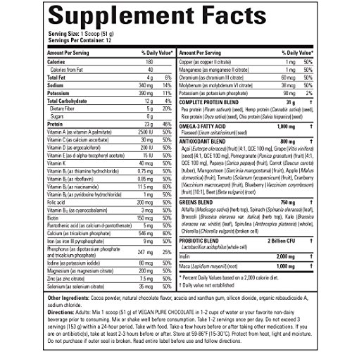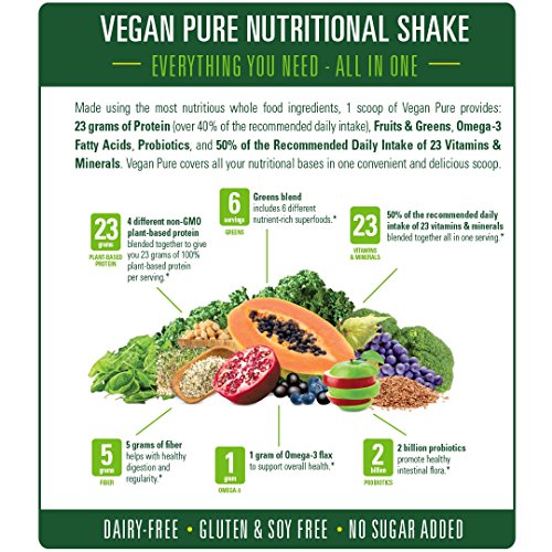 Vegan Pure is a delicious whole food nutritional powdered shake mix that is 100% plant based & provides 50% of the Recommended Daily Intake of 23 vitamins & minerals & 21g of plant-based protein & 1 gram Omega-3. Mix with your favorite non-dairy beverage.