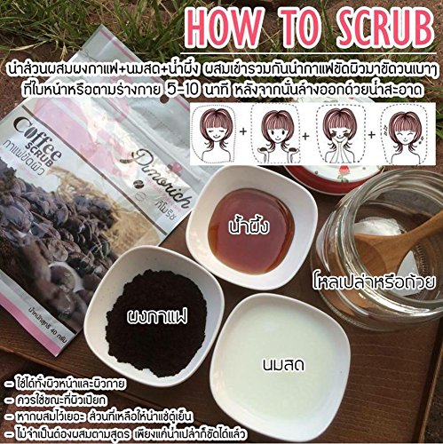 Thailand FDA : 10-1-5747295 How to use "Pimorich" Coffee Scrub. Mix coffee powder + milk + honey mixed with coffee scrub together the skin gently on the face or body for 5-10 minutes, then rinse with clean water.