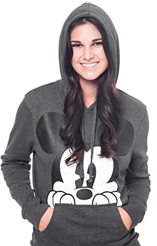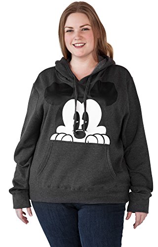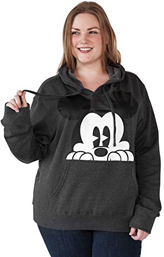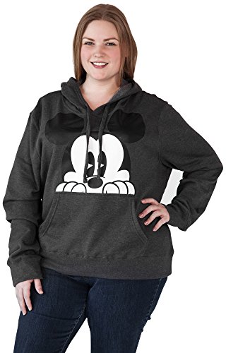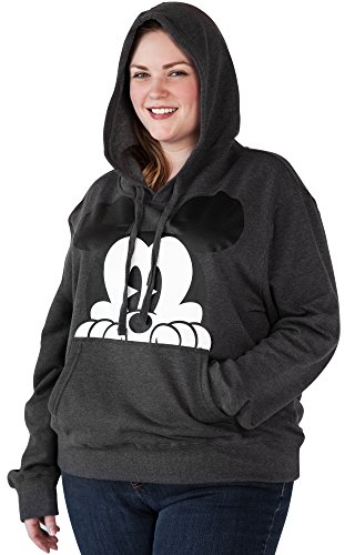 Disney Women's pullover hoodie with front pouch pocket. Front graphic is Mickey Mouse peeking out from behind the front pocket. Charcoal grey color, long sleeves, no print on back and drawstring hood. It is medium weight, 60% cotton / 40% polyester, and is very soft. Women's sizes Small, Medium, Large & X-Large and Women's plus sizes 2X & 3X.Feature