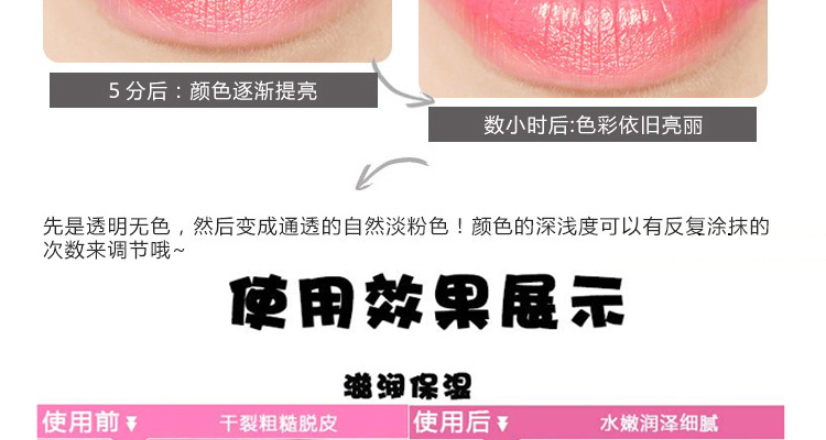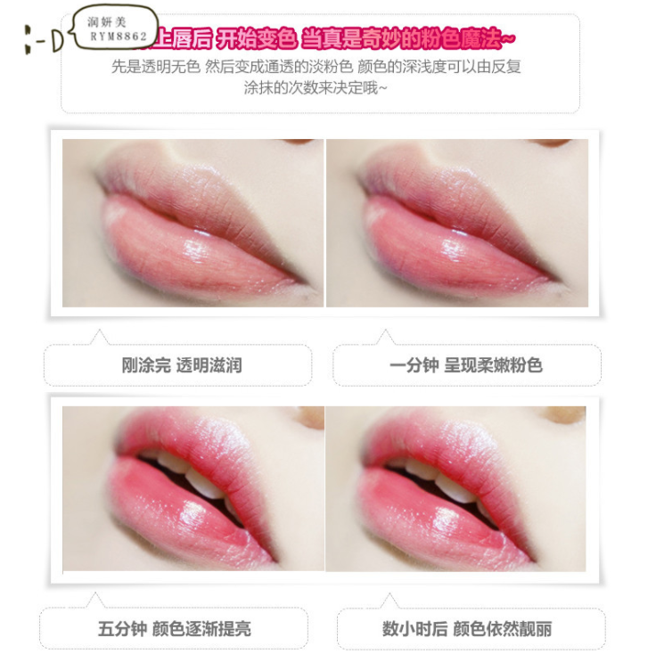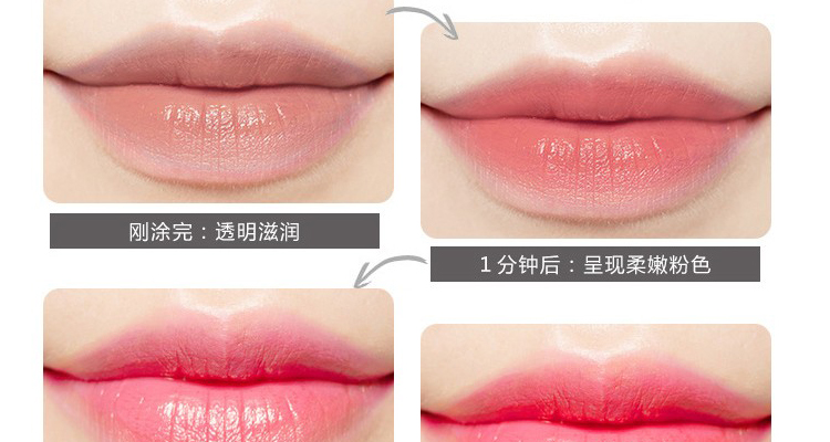 After the application will be based on the temperature of the lip and PH value of the color change, not oil is not too sticky, and very moist, first into a transparent pink, and finally will look good transparent red!