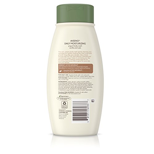 Gently cleanse and nourish your skin with Aveeno Active Naturals Daily Moisturizing Yogurt Body Wash. This rich, creamy body wash, with a delightful vanilla and oat scent, gently cleanses and nourishes for skin that is soft and smooth long after you shower. Nutrient-rich yogurt combines with Active Naturals oatmeal to keep your skin velvety soft and healthy looking. From the dermatologist-recommended brand, this soap-free and dye-free body wash is ideal for daily use. Aveeno Active Naturals Daily Moisturizing Yogurt Body Wash offers a rich, wholesome, moisturizing experience that is good for your skin and your senses.Feature