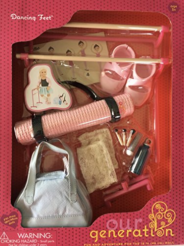 This Ballet Accessory set includes: 1 set pink ballet barres, 3 makeup brushes, 1 lip gloss tube, 1 water bottle, 1 pair pink ballet shoes, 1 position chart, 1 pair white leg warmers, 1 pink mat with stretching strap, and 1 blue bag.