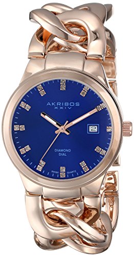Studio : Akribos XXIV Publisher : Akribos XXIV Binding : Watch Product Description Rose gold-tone base metal case with a base metal bracelet. Blue sunray dial with rose-tone, luminescent hands and genuine diamonds on rose-tone setting hour markers. Dial Type: Analog. Luminescent hands. Date display at 3 o'clock. Quartz movement. Scratch resistant mineral crystal. Push/pull crown. Snap-down case back. Case diameter: 38 mm. Case thickness: 12 mm. Round case shape. Band width: 24 mm. Band length: 7.5 inches. Jewelry clasp. Water resistant at 10 meters / 33 feet. Functions: date, hour, minute, second. Watch label: Hong Kong. Akribos XXIV Rose Gold-tone Base metal Ladies Watch AK759RGBU. 0