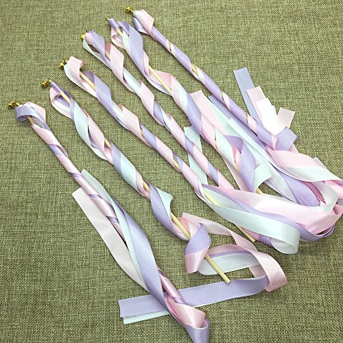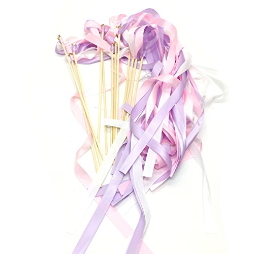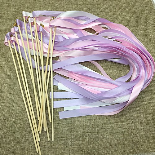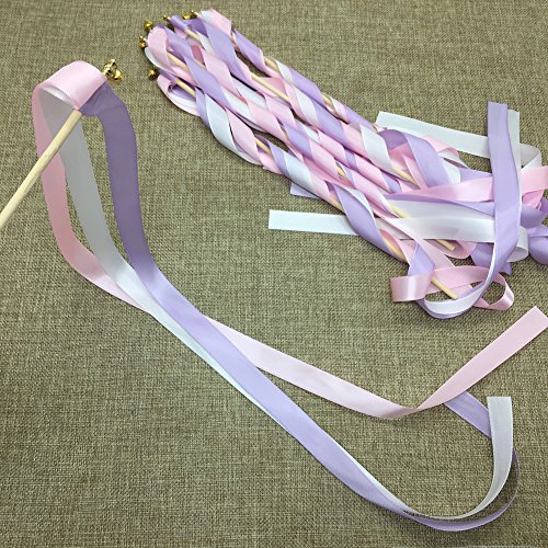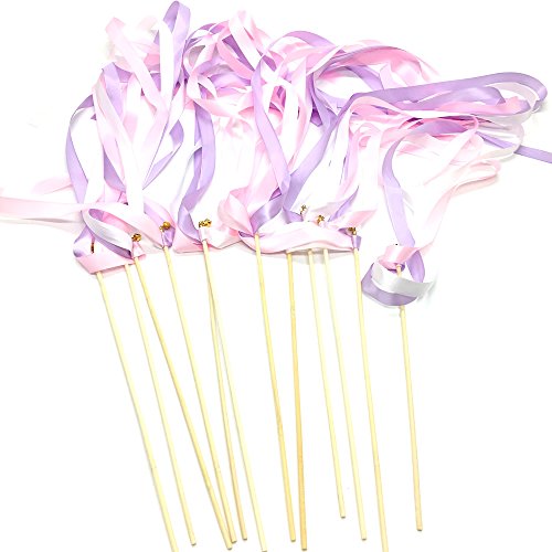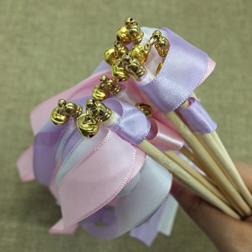 HUELE 12'' Pink and Purple Wedding Ribbon Wands With Gold Bell Ribbon Twirling Streamers Wedding Ribbon Stick (12Pack)