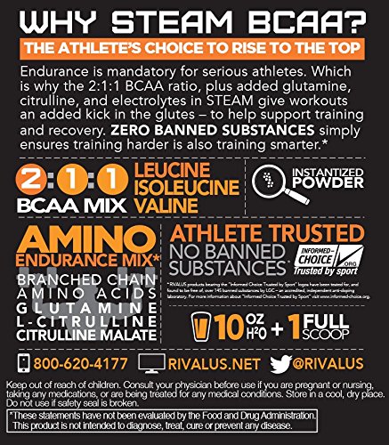 ReleaseDate : 2016-09-23 Studio : Rivalus Publisher : Rivalus Binding : Health and Beauty Product Description About one third of skeletal muscle ? the type that flexes and gets stronger when you exercise ? is made up of branched-chain amino acids (BCAAs). So it shouldn’t be that surprising to learn that athlete’s requirements for leucine, isoleucine, and valine are higher, or that supplementing with these key aminos has been scientifically demonstrated to improve performance. * STEAM BCAA helps you train longer and supports recovery with a kick-in-the-glutes combination of BCAAs (popular 2:1:1 ratio), plus added glutamine, citrulline, electrolytes, and vitamin B6. No banned substances or added sugar simply ensures training harder is also training smarter. Never run out of STEAM. * *These statements have not been evaluated by the Food and Drug Administration. This product is not intended to prevent, treat, cure or prevent any disease. (1) Per serving. Information may vary by flavor. Refer to nutritional, ingredient, and allergen information for complete details. 0