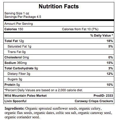 -. Feature : Raw and All Organic Ingredients -- Paleo Approved. / Sprouted- Amazing taste! / Dehydrated at low temperate to preserve enzymes / Gluten and Grain Free, comes in resealable pouch. / Bit size pieces, perfect for dipping or munching