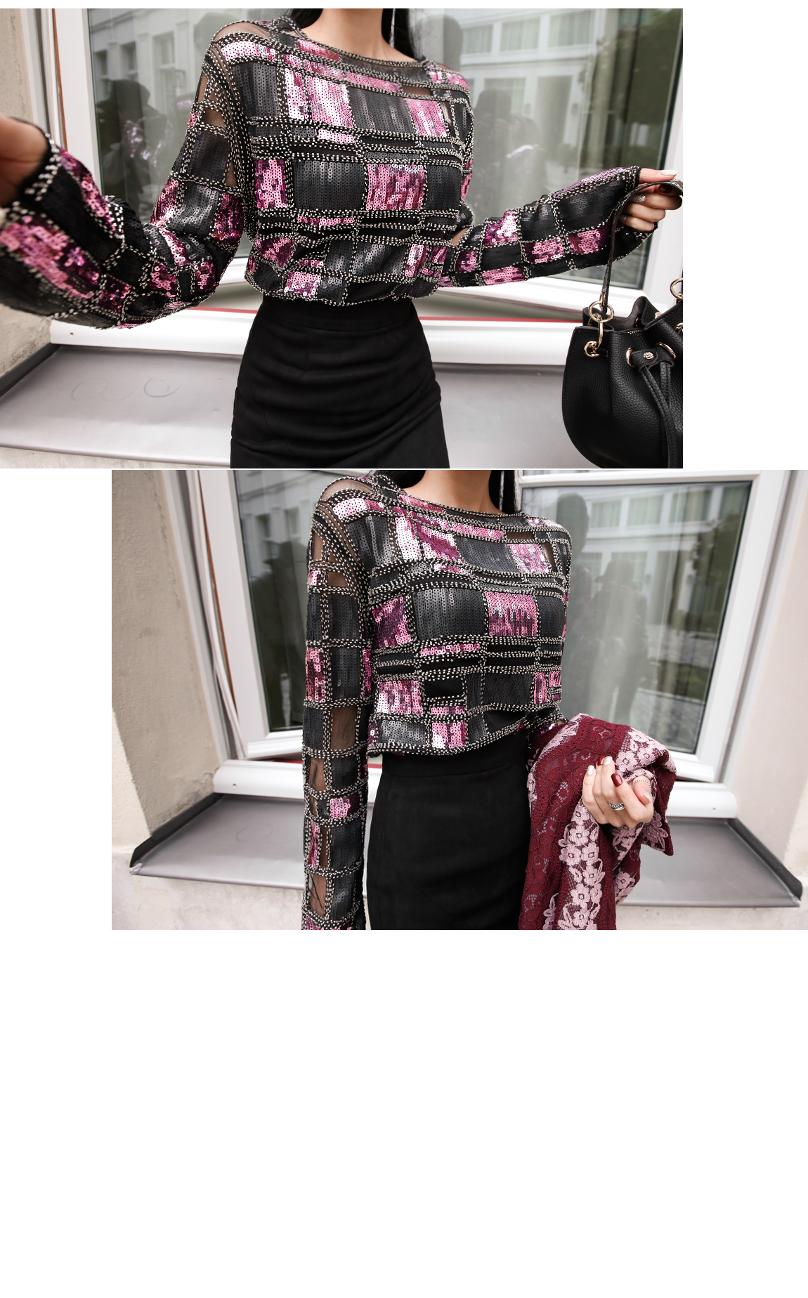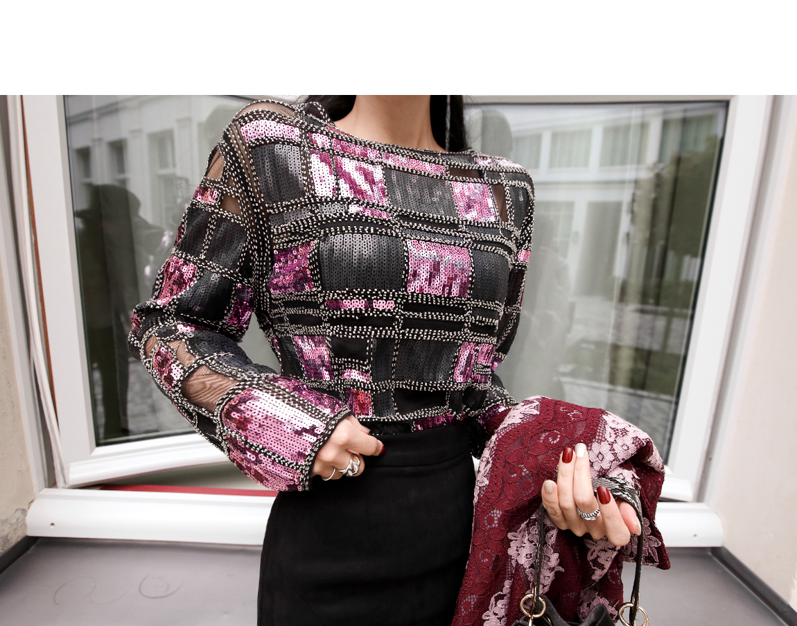 スパンコールとシースルーの配色がユニークなブラウスです