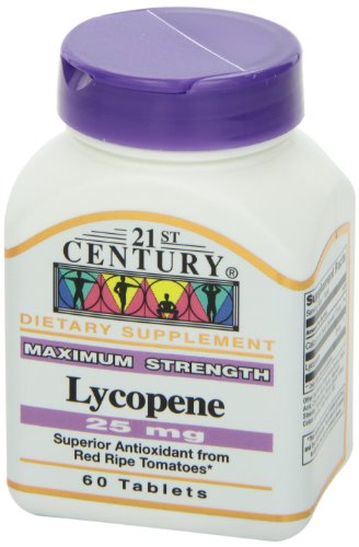 21st Century's Lycopene dietary supplement provides superior antioxidant support for total body health while also promoting healthy prostate function. Found in red ripe tomatoes, lycopene continues to get a lot of research attention for its potential prostate health support. Each maximum strength tablet contains 25 mg Lycopene, approximately the same amount as 5 medium red ripe tomatoes.Feature